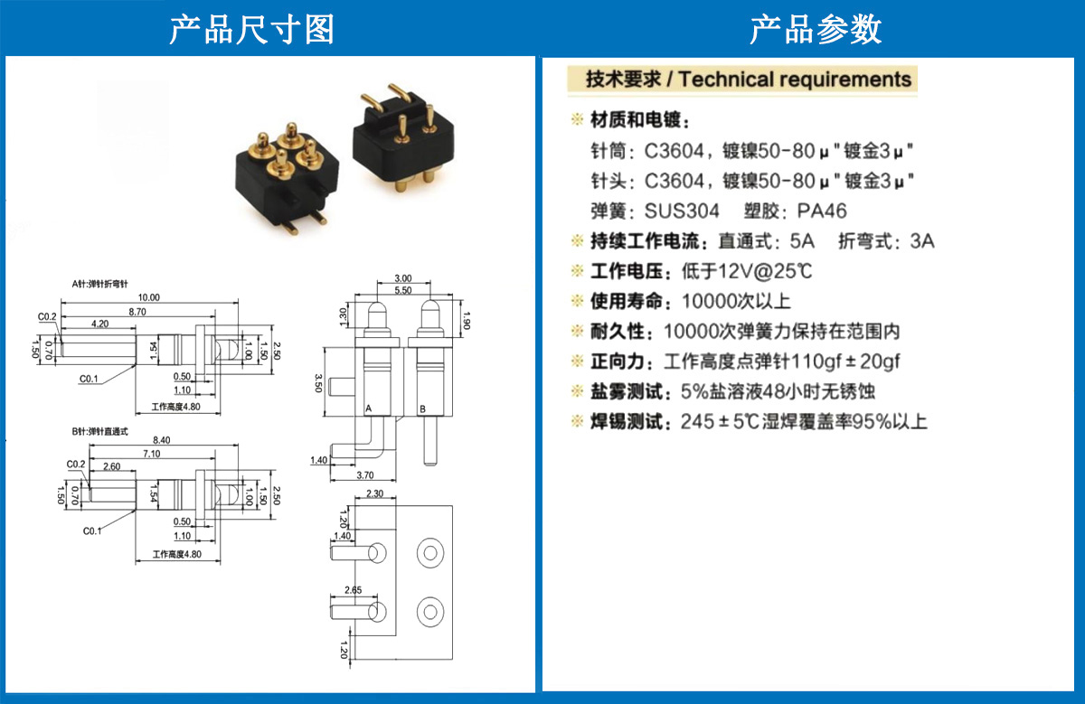 產(chǎn)品介紹:這個(gè)針通常用于智能手表,藍(lán)牙耳機(jī)上的有充電的功能,但是探針總體來(lái)說(shuō)還是測(cè)試的
