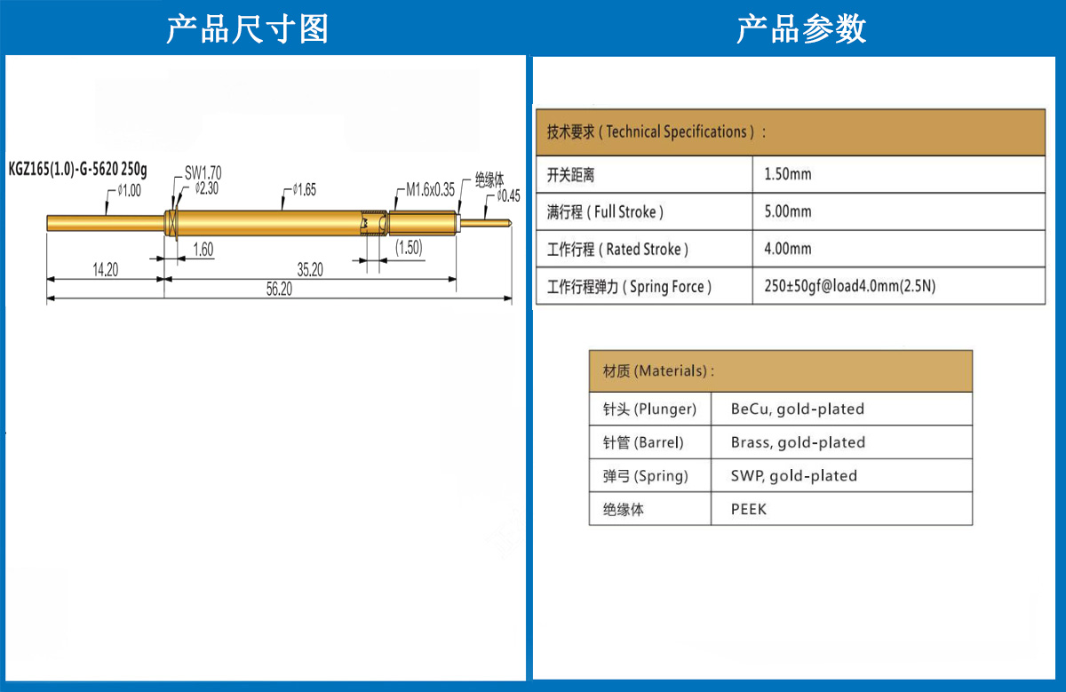 產品簡介:KGZ165探針、1.65mm測試針、總長56.20mm、彈簧針、測試針