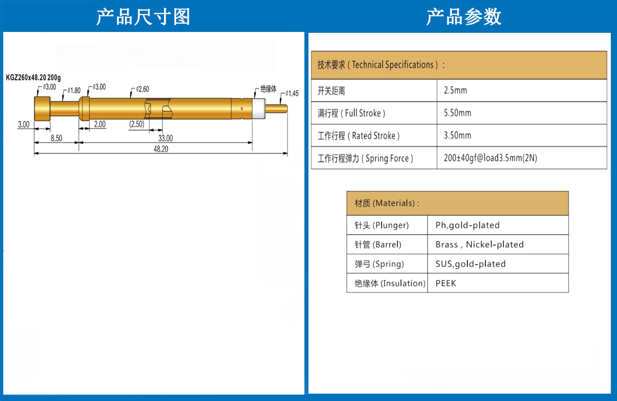 產品簡介:KGZ260探針、2.60mm測試針、總長48.20mm、彈簧針、測試針